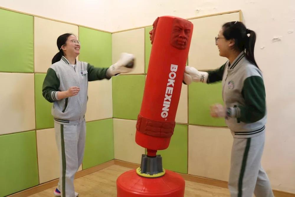 “今天下午刚有场数学考试,好难做啊,宣泄室里有沙包,我把它当作数学题,打几拳就舒服了!”来自高三的张珂笑着分享自己宣泄情绪的原因。