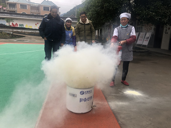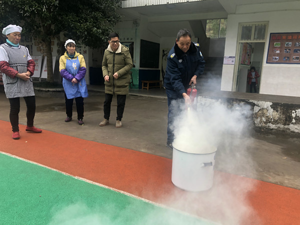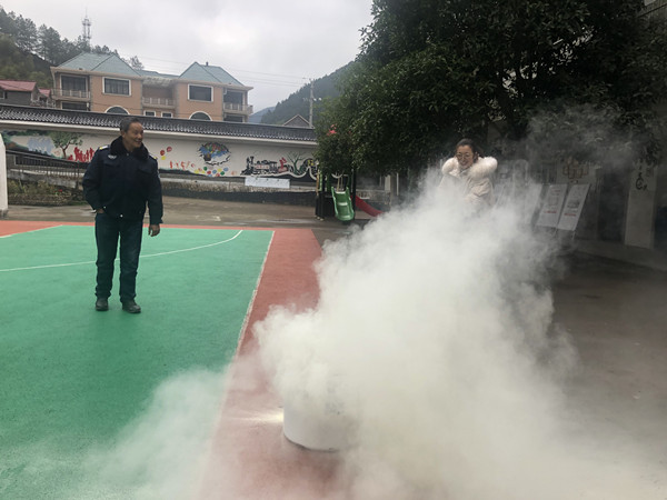 12月12日,西畈小学教职工和后勤人员在操场上进行消防安全培训。