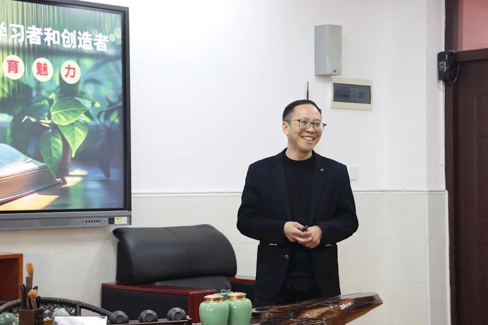 随后,在会议室内,校长鲍宗武以《让师生成为主动自觉的学习者和创造者——绽放实验教育魅力》为主题的报告。他提到以教育使命让学生成为一个主动自觉的学习者展开分享。他说,当学生对学习有兴趣,成为一个主动自觉的学习者时,学习不再成为一种负担,而是一种快乐。