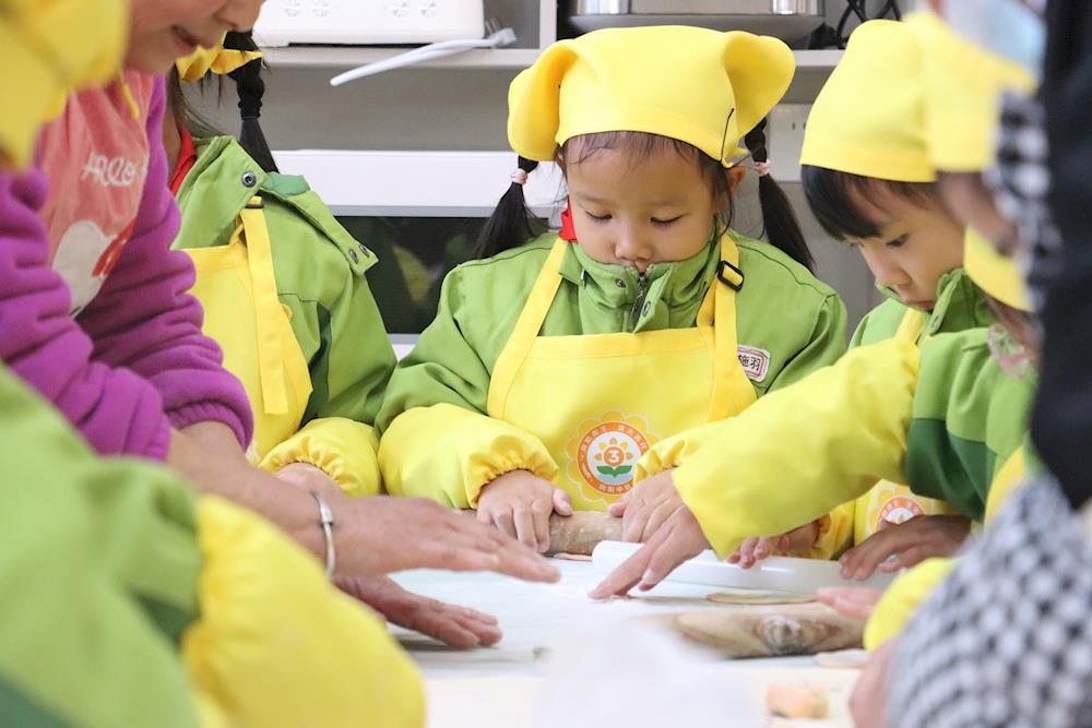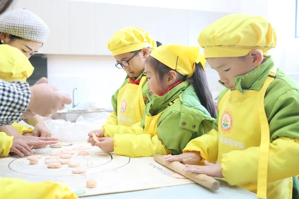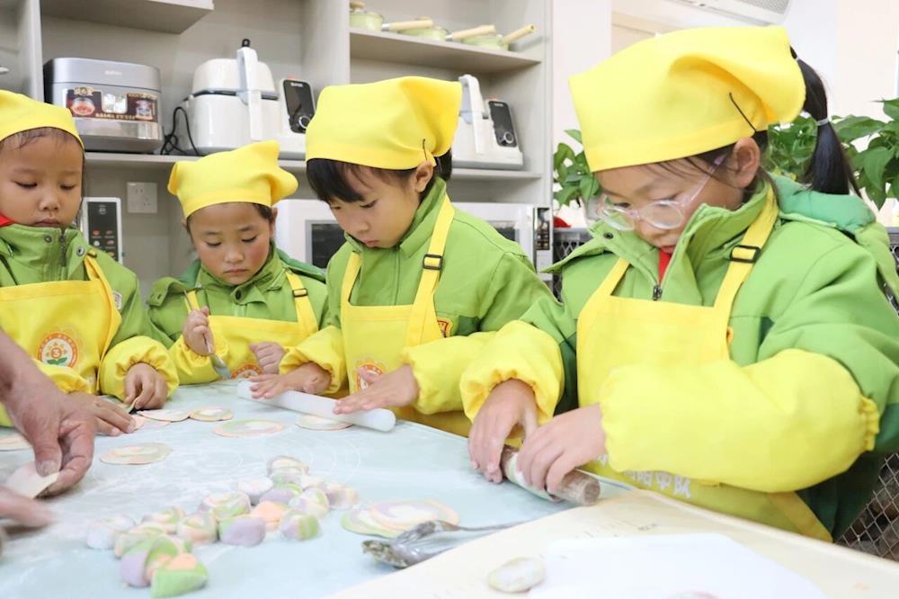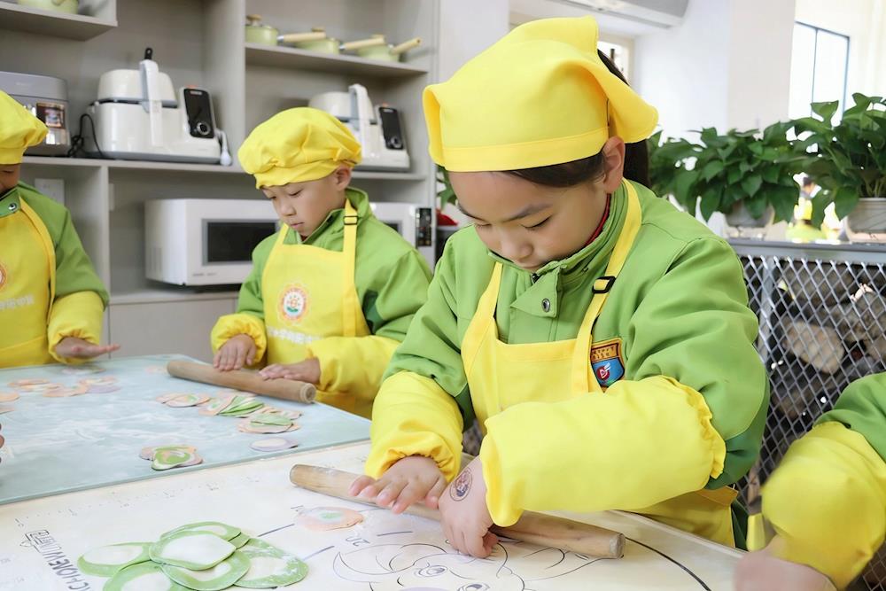 食堂的烘焙坊中,家长志愿者早早将面粉、馅料、擀面杖等材料整齐摆放在课桌前。“先把面团揉成光滑的小圆球,再用擀面杖擀成薄薄的圆片……”家长一边示范,一边耐心讲解包饺子的步骤。