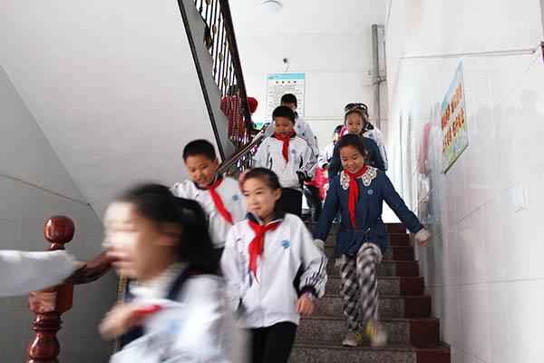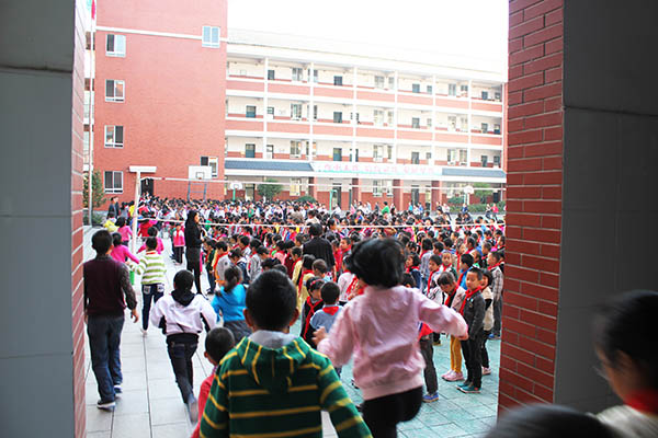 早上8:35,遂昌育才小学校园内响起了急促的警报声,广播里传来了“全体师生请注意,全体师生请注意,学校突发紧急异常情况,需要同学马上从教室撤离到操场上,需要同学马上从教室撤离到操场上,请各位老师各就各位,请同学们在老师的组织下排好队伍,安静、有序地快速撤离”。警报声响,全体教师按照演练方案的岗位要求及时到岗,900名学生在课任教师的组织下排着队伍有序撤离到了指定地点。整个过程用时1分55秒。